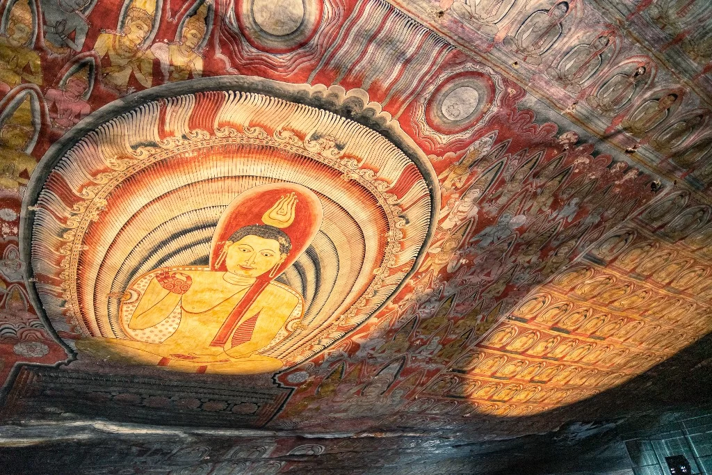 The vibrant colors and intricate designs found in these ancient murals are more than just visually captivating; they echo profound symbolism and meaning. Each brushstroke reflects the rich Sri Lankan heritage and embodies the essence of Buddhist art, rockcut architecture, and ancient murals found within sacred caves.